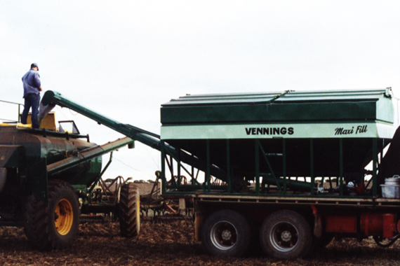 Fast and efficient loader for air-seeders and combines, 40 row wide lines can be filled from one position. Patented folding and swivelling “U” shaped elevating belt. Able to handle all types of seed and fertilizer without cracking and damaging. Seed bin completely self-emptying. Super bin has simple hinged bottom door to allow cleaning and maintenance on cross auger. Two electric actuators operate seed and super doors by a switch at the top of the tabulator. Simple, efficient direct coupled hydraulic motor drives unit fitted with 21 H/P Vanguard Electric Start Motor. The Bin has two separate waterproof lids as standard.